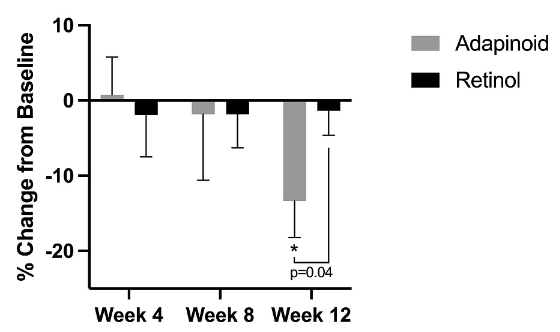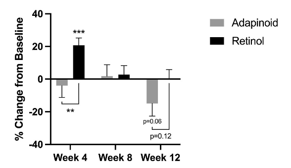 W ten sposób porównywano działanie 0,5% retinolu vs 0,5% adapinoidu w takiej samej bazie kosmetycznej.
