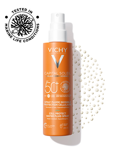 - Vichy capital soleil cell protect water fluid SPF 50+ bazuje na technologii Netlock, przez co tworzy na skórze jednolity, odporniejszy film. Zawiera alkohol i filtry chemiczne, w tym starszy Avobenzone, ale jest stabilny dzięki dodatkowi nowych filtrów.